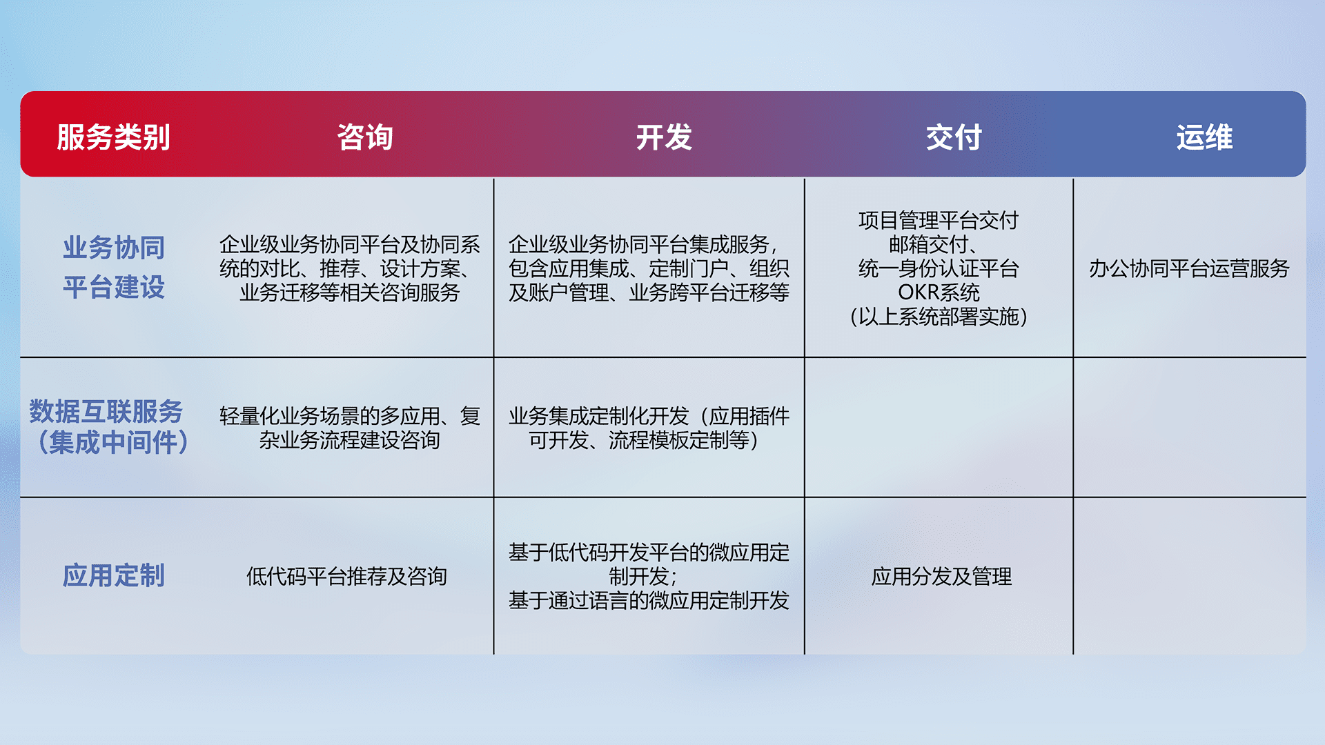 针对钉钉、、、企微、、IDaas等平台级产品提供产品的规划、、、方案、、、、交付、、、定制化开发等服务,,,,实现如统一协同办公、、、智能客户服务、、、、混合会议管理、、智能数据查询、、、、等业务场景,,实现数字化转型。。