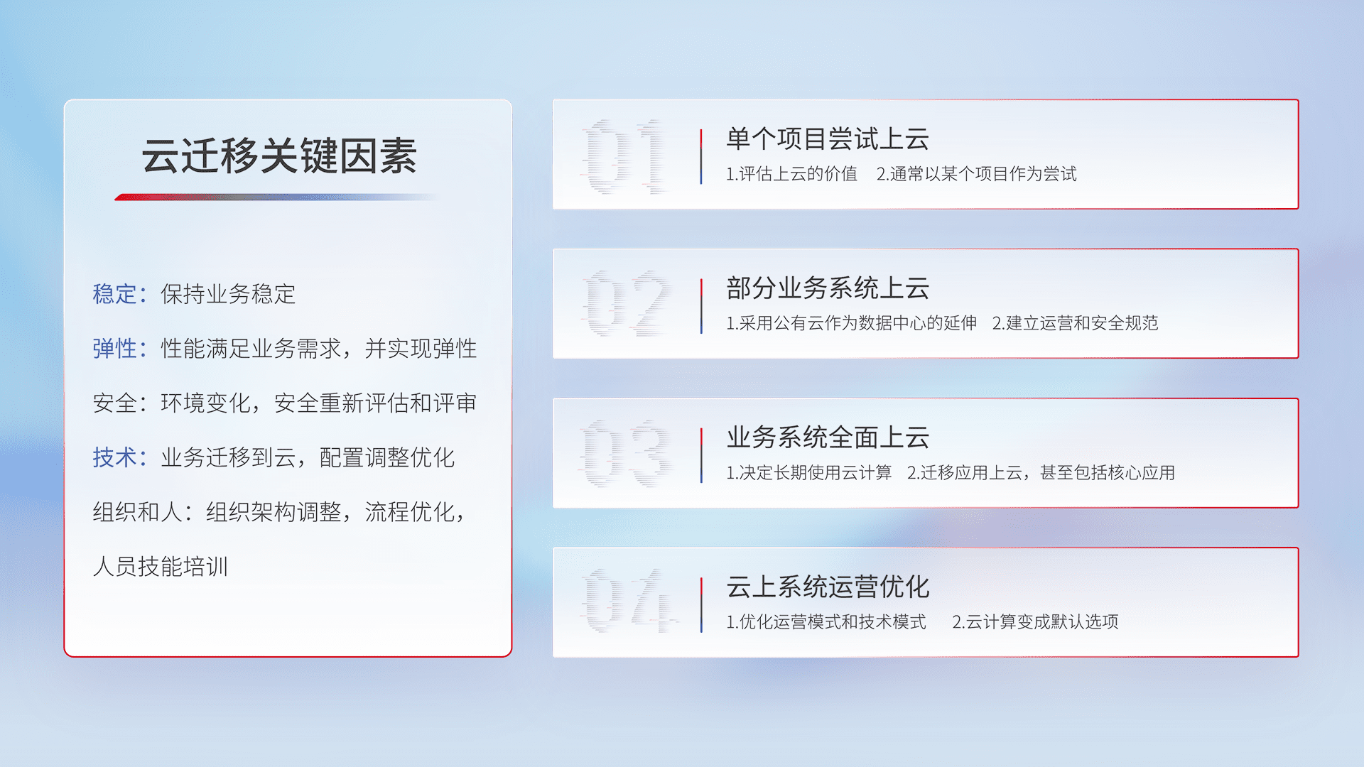 结合实际业务,,,从规划设计、、、云平台选型、、、云原生改造、、数据迁移、、、集成交付,,,迁移全过程为客户识别最佳上云路径,,,,做好风险识别管理,,,设计网络架构、、、、身份权限、、、安全审计合规、、、、操作审计、、、、日志审计、、、、监控告警策略、、、多站点容灾设计等,,,对云上基础设施进行整体规划,,提升IT治理水平,,以满足弹性、、、、高可用、、高性能的需求。。。