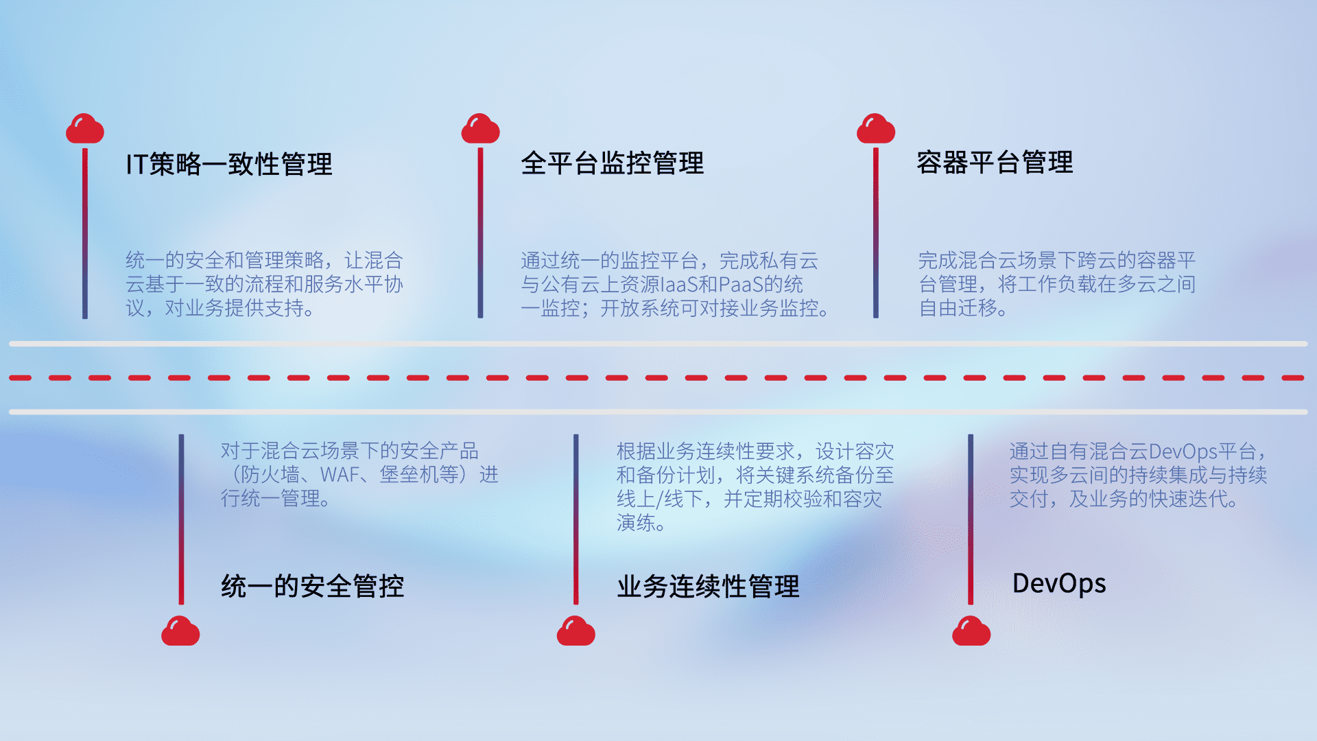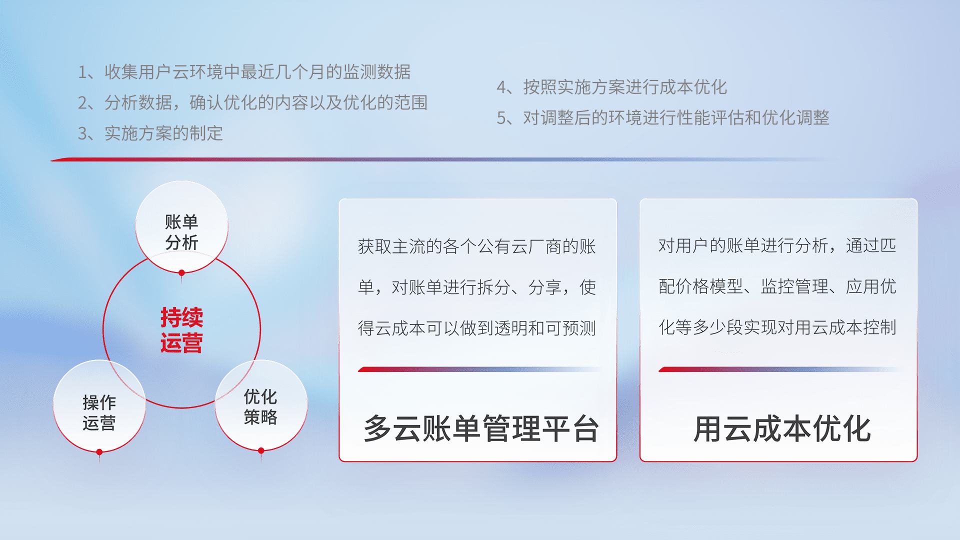 通过多云纳管,,,以统一的资源数据模型把客户的云资源进行抽象和封装,,进而实现对多云资源的统一操作,,,,保障云资源管理的可靠性、、、稳定性与可用性。。。量身定制化运维内容,,配置、、、开发运维、、、、补丁管理、、、、备份、、、、监控、、、认证和访问管理、、审计和日常巡检等,,保障在用云过程中的可靠度,,,稳定度以及高可用率。。